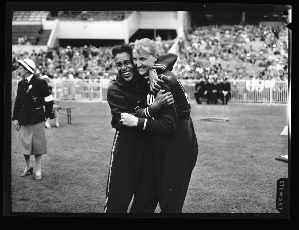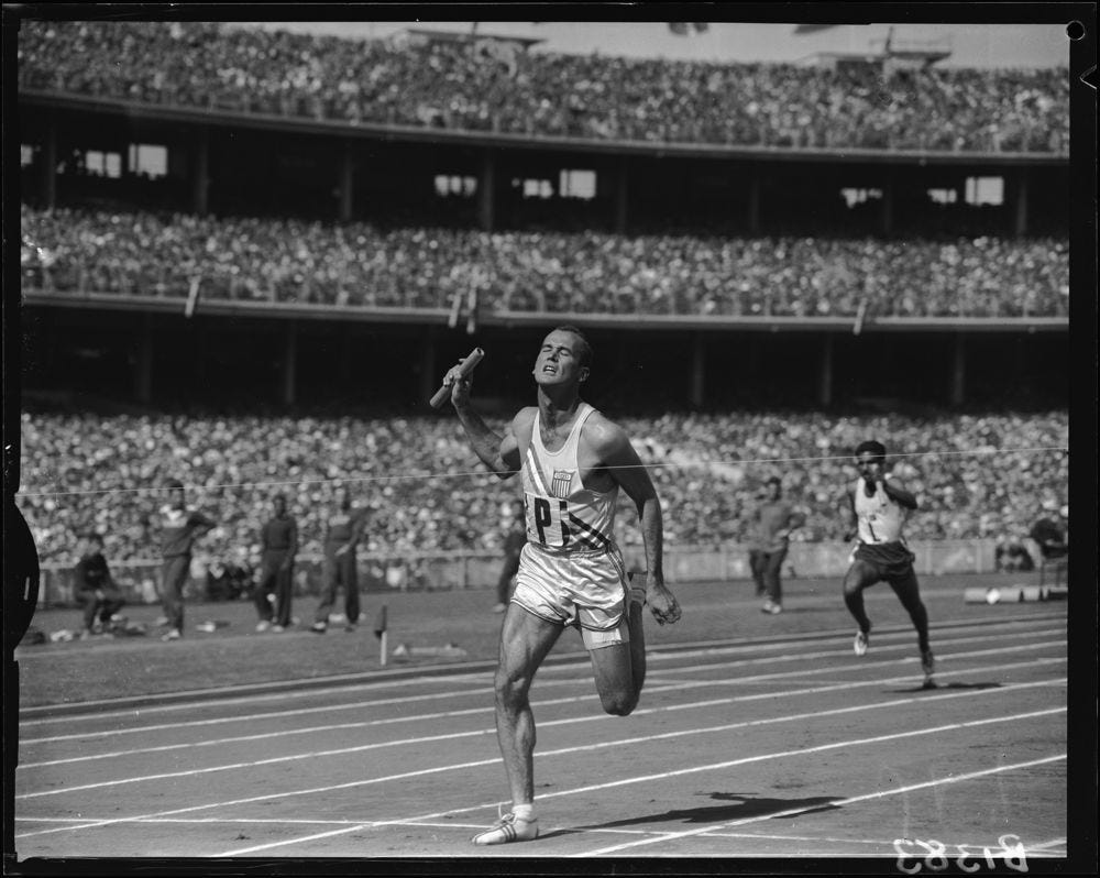 There’s a distinct school sports day vibe in all these images. Mostly it’s the material palette. Compared to modern sporting spectacle (bright saturated colours, synthetics, plastics, LED screens), mid-century sport was grass, cinders, and organic fibres like wool, leather and cotton. The looser-fitting race kits remind me of when I wore an oversized shirt and baggy shorts to Little Athletics (my glory years).